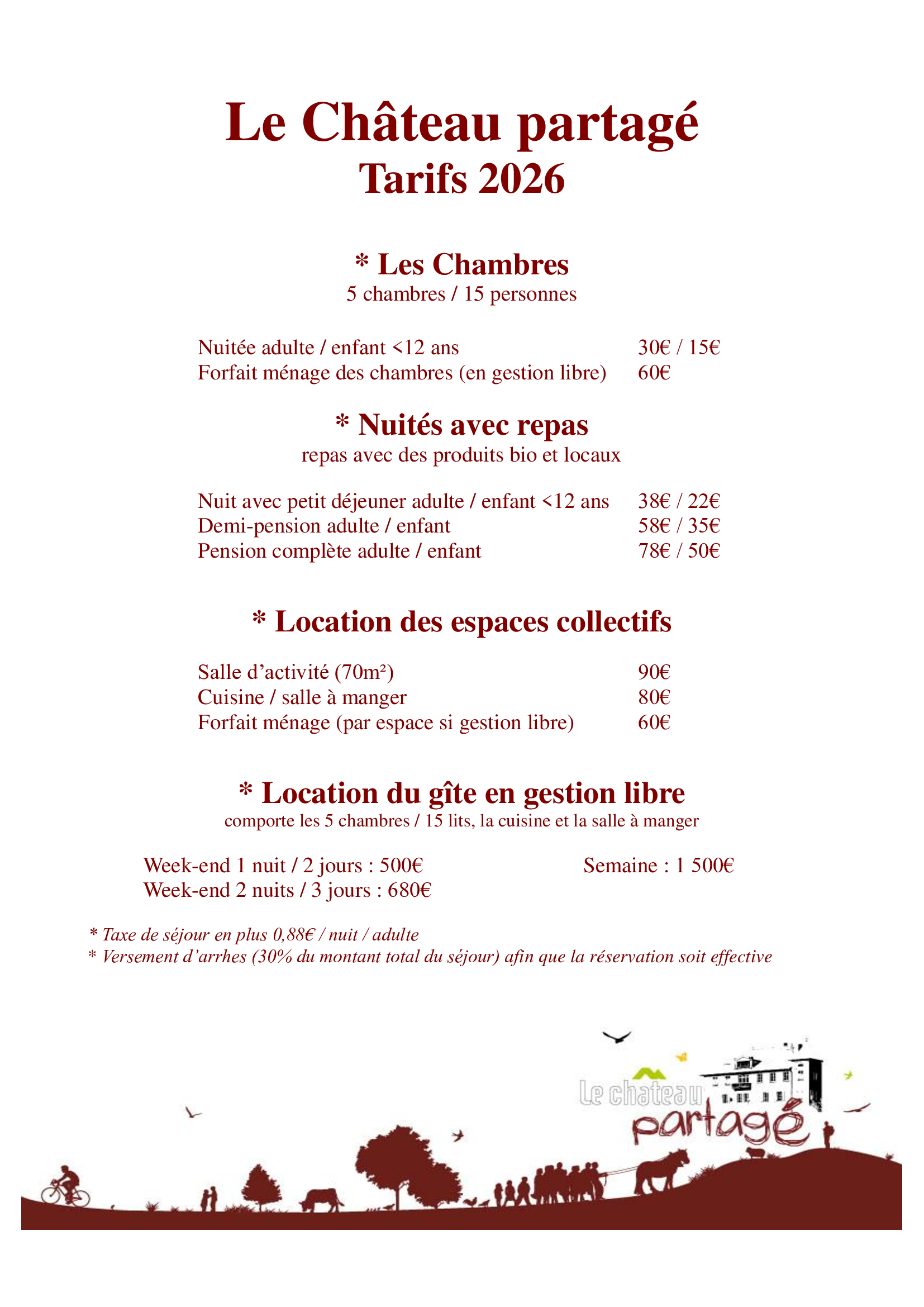 Le Château Partagé étant le lieu d’habitation pour 6 foyers, les fêtes tardives et bruyantes (anniversaires, mariages, rassemblements festifs…) ne sont pas compatibles avec la vie du lieu.